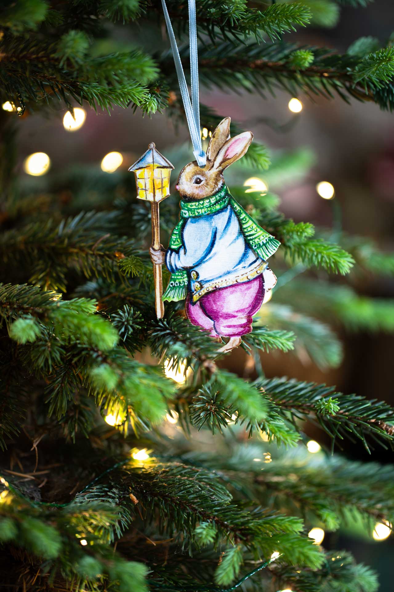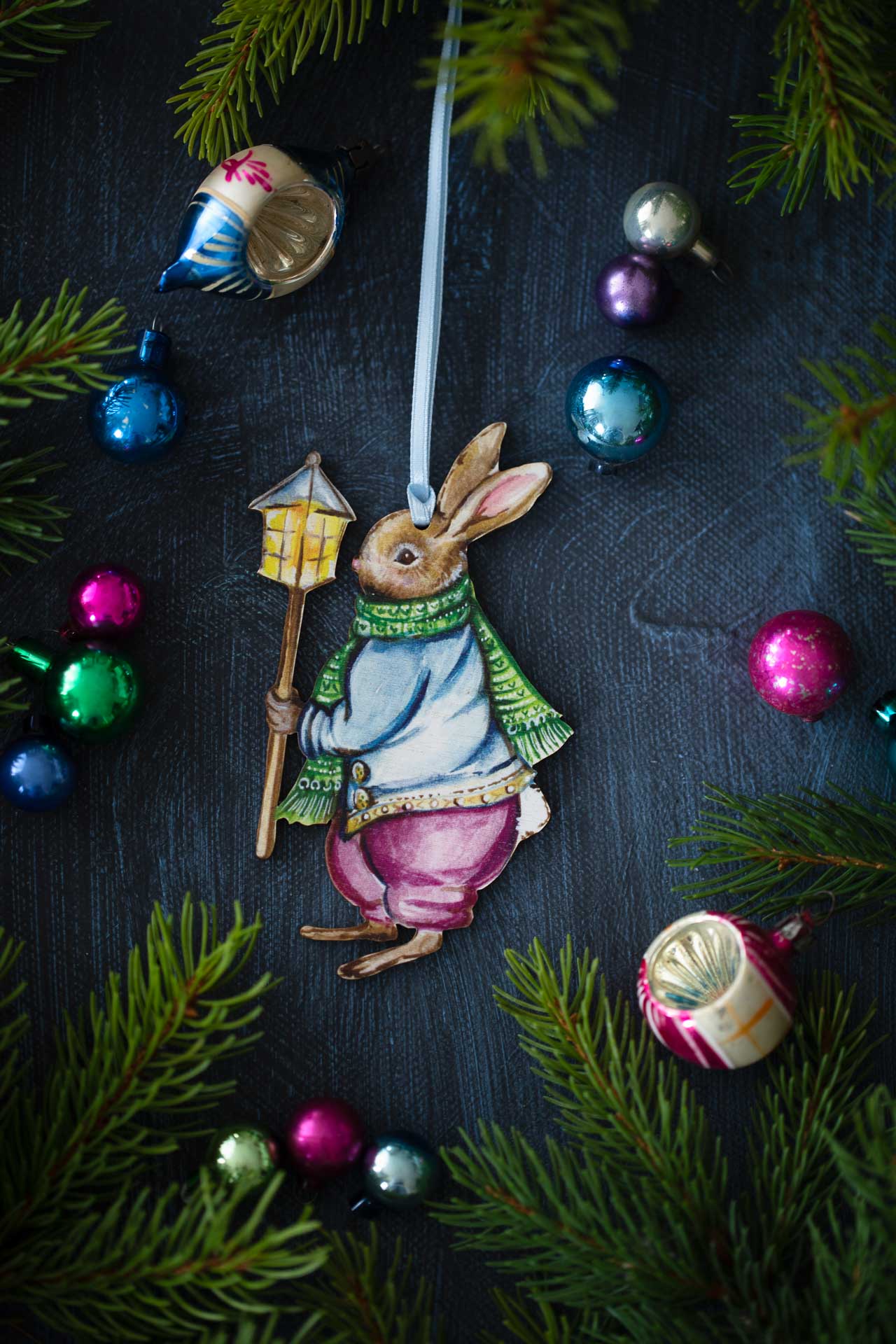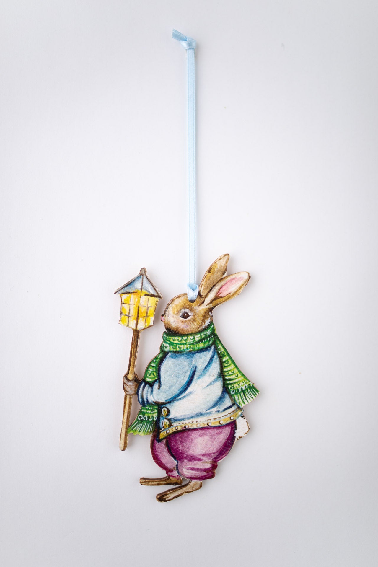 Christmas Boy Bunny With Lantern ~ Hanging Wooden Decoration