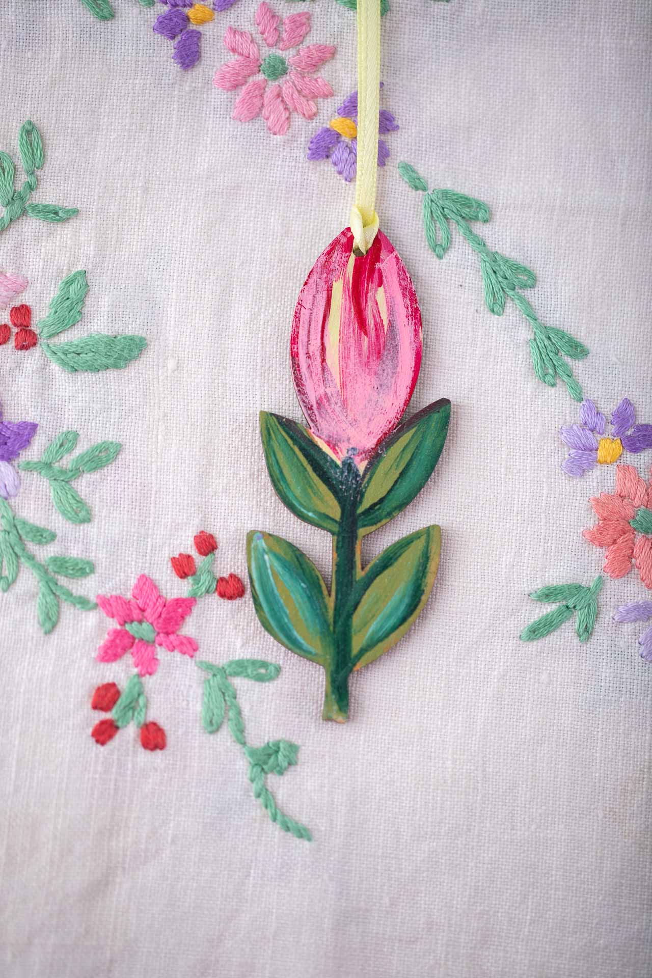Discover a delightful collection of seven hand-painted wooden flower hanging decorations, each one uniquely designed , painted and signed by Amy Swann.