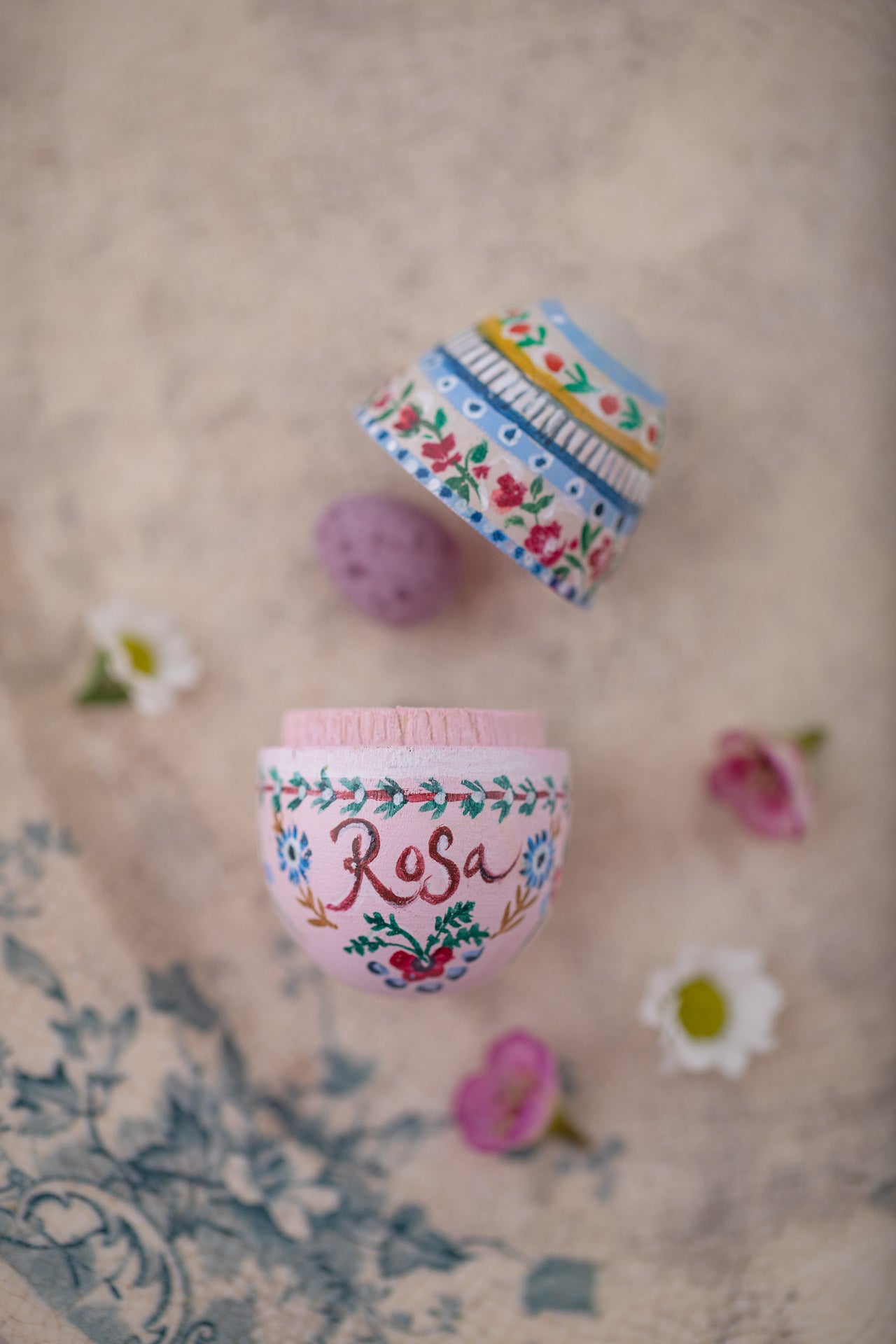 A beautiful limited edition fillable wooden egg exclusively designed and hand painted by Amy Swann with an intricate and dainty design.