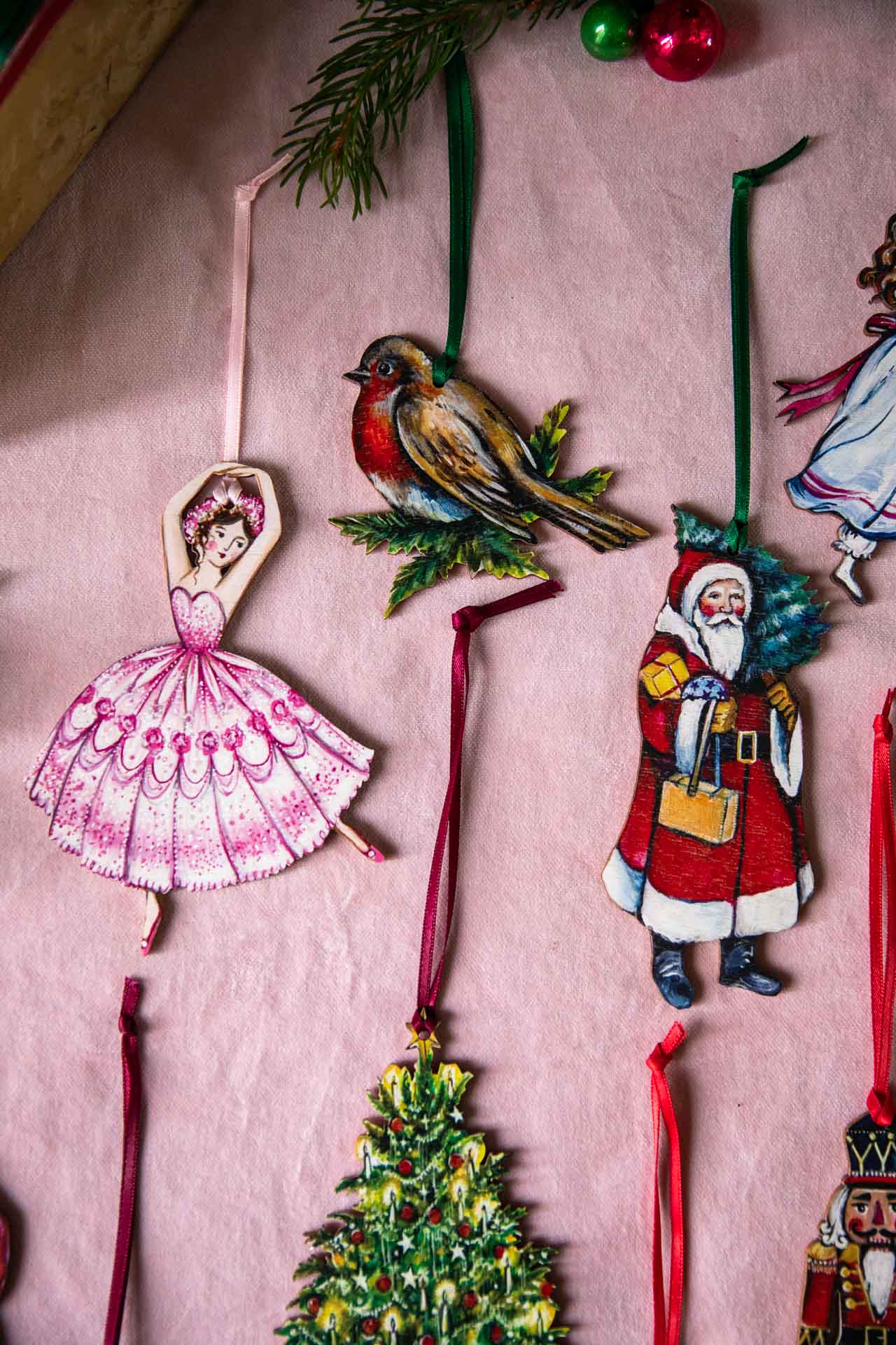 A magical and exclusive hanging heirloom wooden decoration illustrated by Amy Swann printed from an original painted illustration.