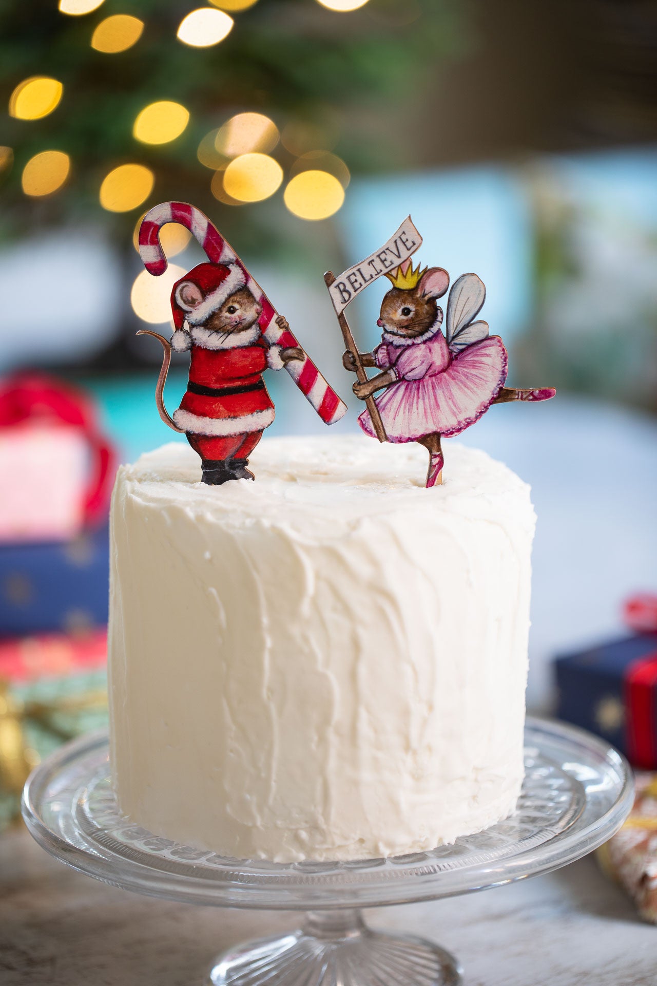 This magical Christmas Santa mouse cake topper is illustrated exclusively by Amy Swann and printed from an original painting. Please note – snowy trees and believe mouse are sold separately.